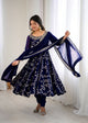 Made from flowy georgette with intricate embroidery and sequin work, the fully flared dress is designed to make a statement. Complete with a matching churidar bottom and  georgette dupatta, this suit is available in a variety of sizes for the perfect fit.