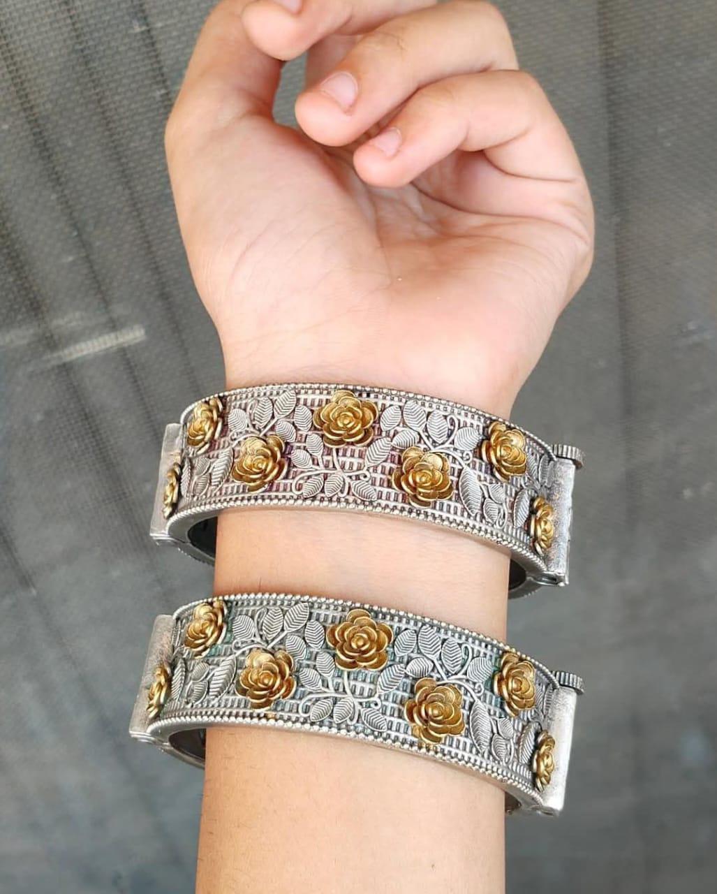 German Silver Dual tone Oxidized Rose and Petals Openable Kada Set of 2