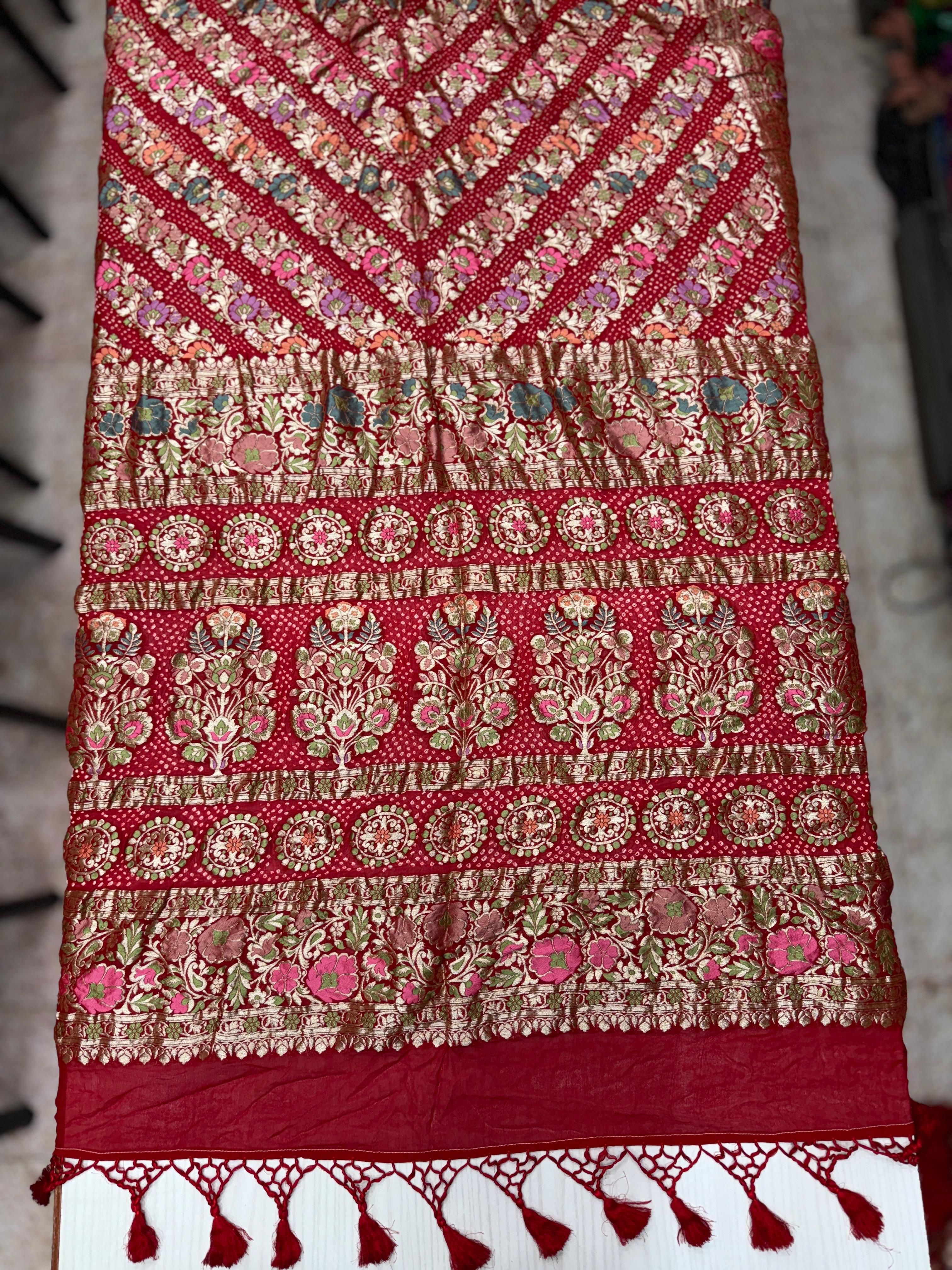 A masterpiece fusion saree of Rai Bandhej, Kadva Zari Lehariya Weaving with Meenakari intricate Handloom weaving
